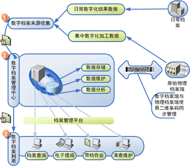 今天,我们能听到很多有关于一体化数学档案馆的介绍,那么,一体化的数字档案馆到底是什么? 乐高软件的理解和定义是,将分散于不同载体、不同空间的档案信息以电子化格式进行存储,在对这些电子化数据进行挖掘分析的基础上,形成从档案信息的电子化收集、到档案的现代化管理、再到档案的网络化应用,这样完整体系的档案管理应用模式。最终通过网络化的方式互相连接,达到传输快捷、信息共享、随需应用的目的。如下图所示:
