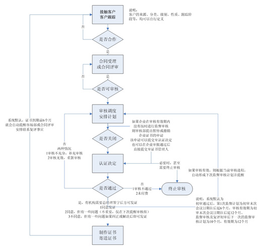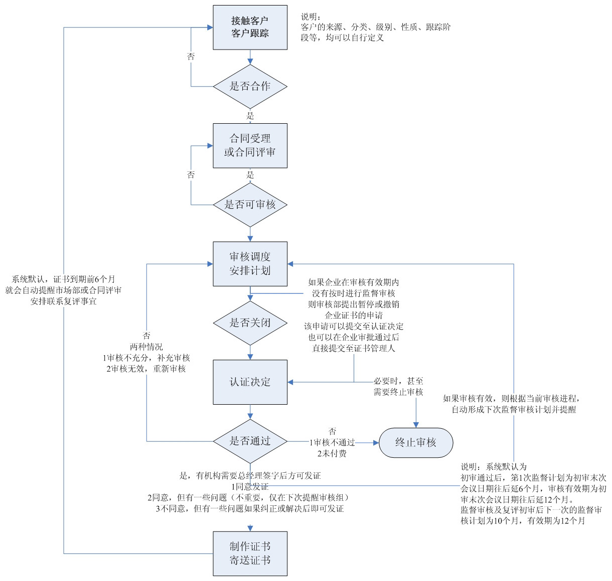 根据我们对认证业务的理解,结合信息系统的实际情况,乐高iACM系统中,针对认证业务的总体流程设计如下图,在认证机构实际应用时,可能会根据机构自身管理方式的不同稍有改变,应用时可以通过系统的权限等进行调整控制。
